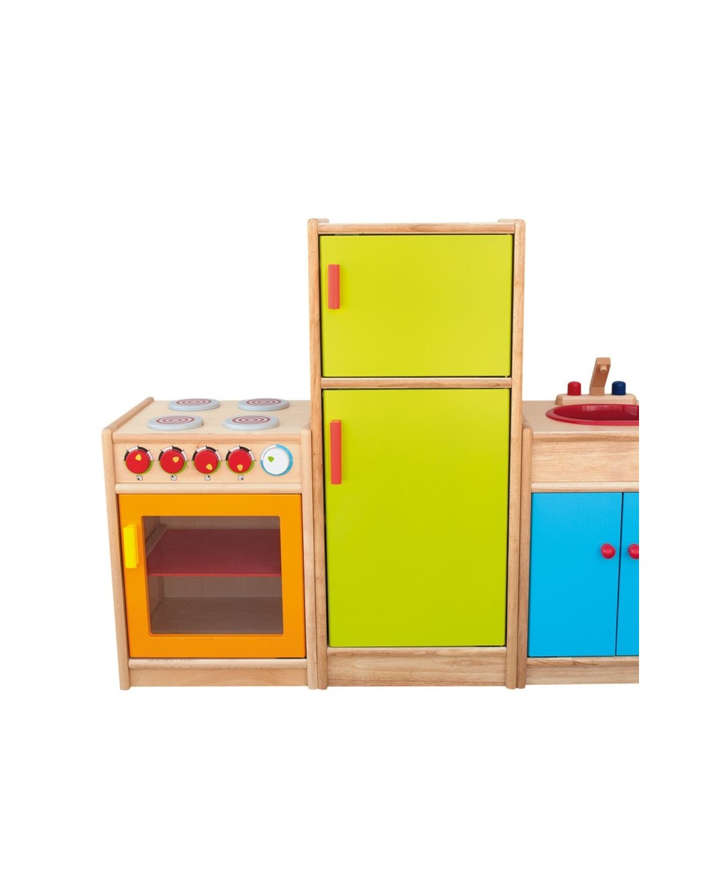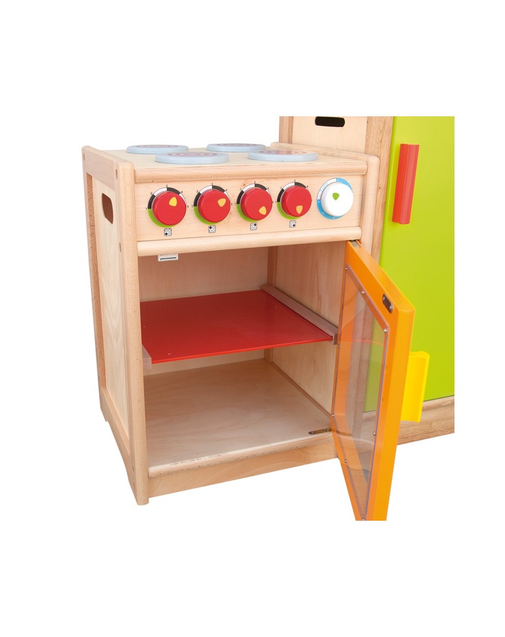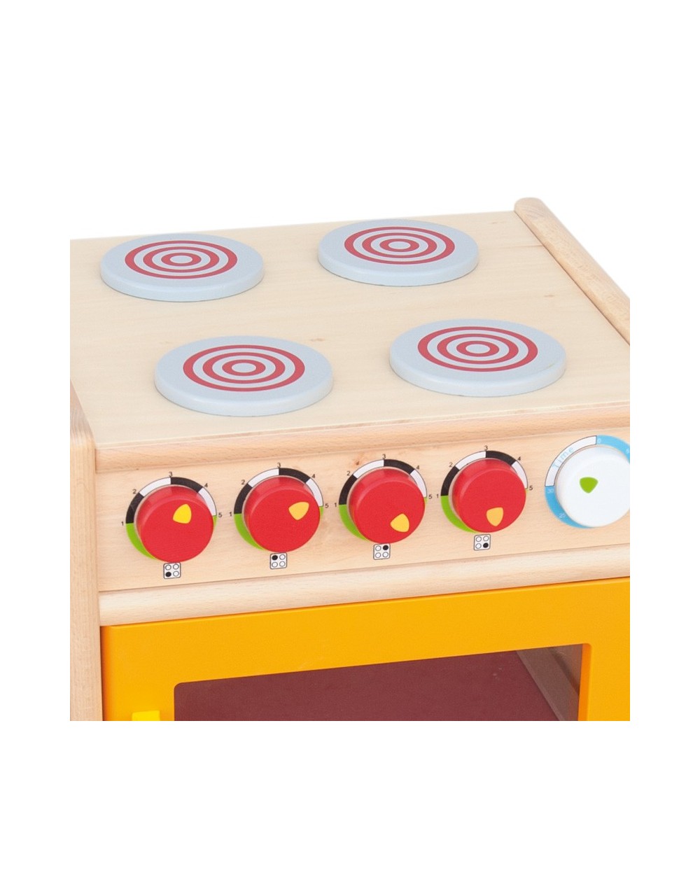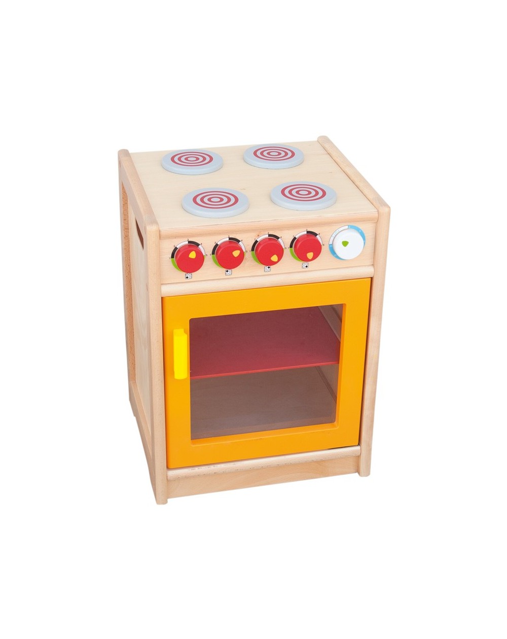A sturdy cooker with 4 burners, 4 control knobs with sound and an oven with transparent door. Very suitable for intensive use by children.