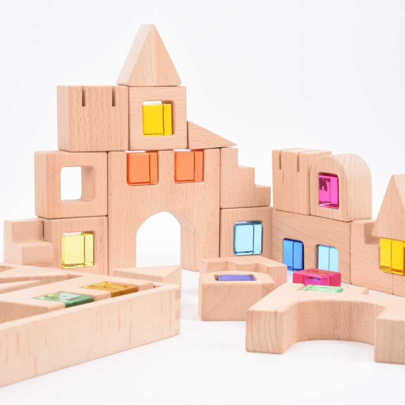 A selection of smooth wooden building block shapes and crystal-clear colourful gem cubes, packed in a sturdy wooden storage tray with guidelines in the plywood base for easy tidying away. The blocks are carefully designed to be open-ended and varied in style, to encourage creative construction for older children or as a simple stacking and balancing activity for younger children.